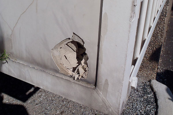 Pitkälle edenneitä vaurioita 2000-luvulla uusittujen parvekekaiteiden alareunoissa jo 10 vuotta asennuksen jälkeen.