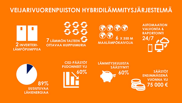 Veijarivuorenpuistossa kaukolämpö korvattiin lähes kokonaan uusiutuvilla energialähteillä: 89 % lämmöstä tuotetaan lämpöpumpuilla ja vain 11 % jää kaukolämmön varaan. Ensimmäisenä vuonna älykäs lämmitys säästi osakkailta yli 75 000 €, eli 60 % lämmityskuluista. Samalla se leikkasi taloyhtiön hiilijalanjäljestä reilusti yli 60 %.