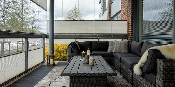 Monilla lasitetuilla parvekkeilla on myös lasitetut kaiteet, joihin voi hankkia parvekekaihdinten kanssa yhtenäiset kaihtimet. Julkisivu näyttää siistiltä, kun parvekekalusteet jäävät kaihdinten taakse ja parvekkeella oleskelu on miellyttävää.